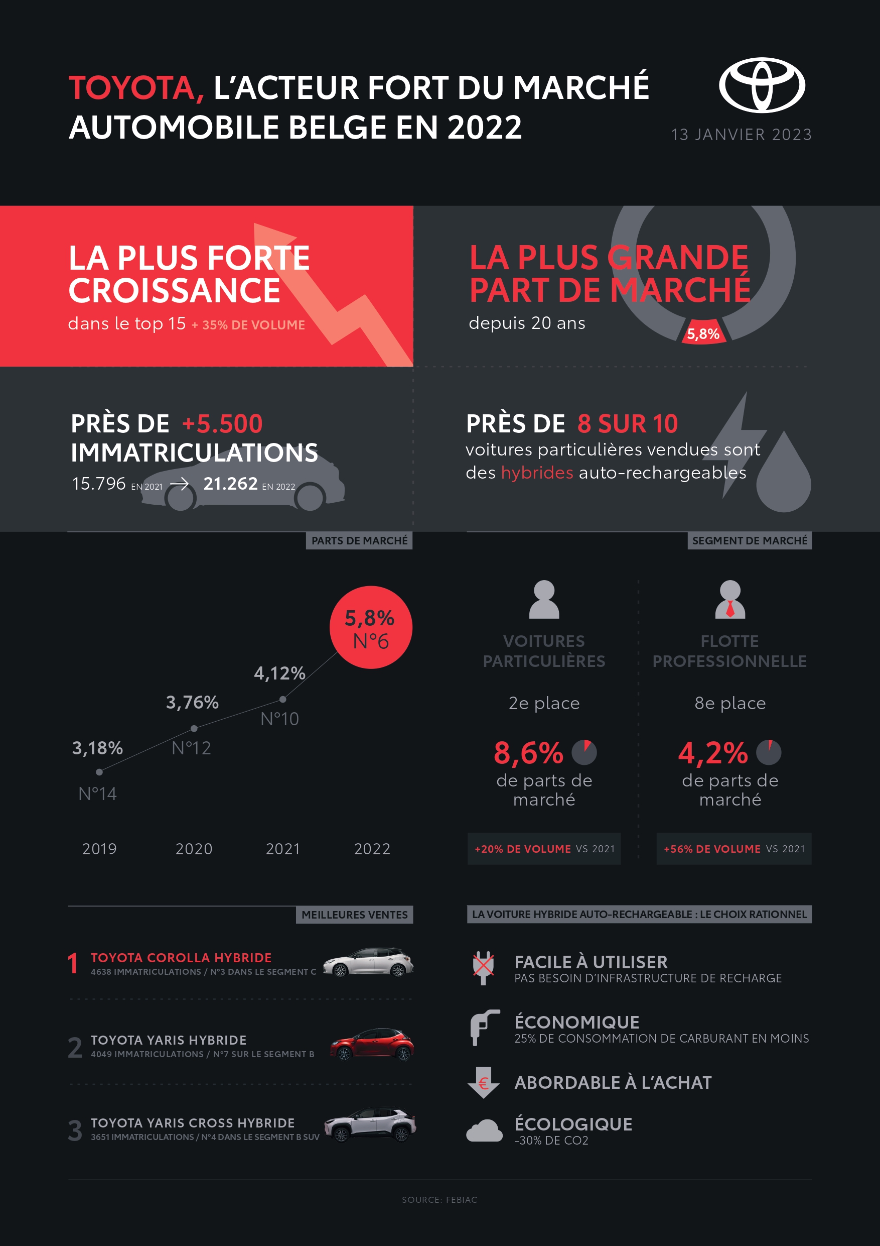 - Toyota se classe au 6e rang des voitures nouvellement immatriculées en Belgique en 2022. Avec une augmentation de 35% en termes de volume et une part de marché de 5,8%, elle représente la plus forte progression du top 10 des marques automobiles en Belgique.